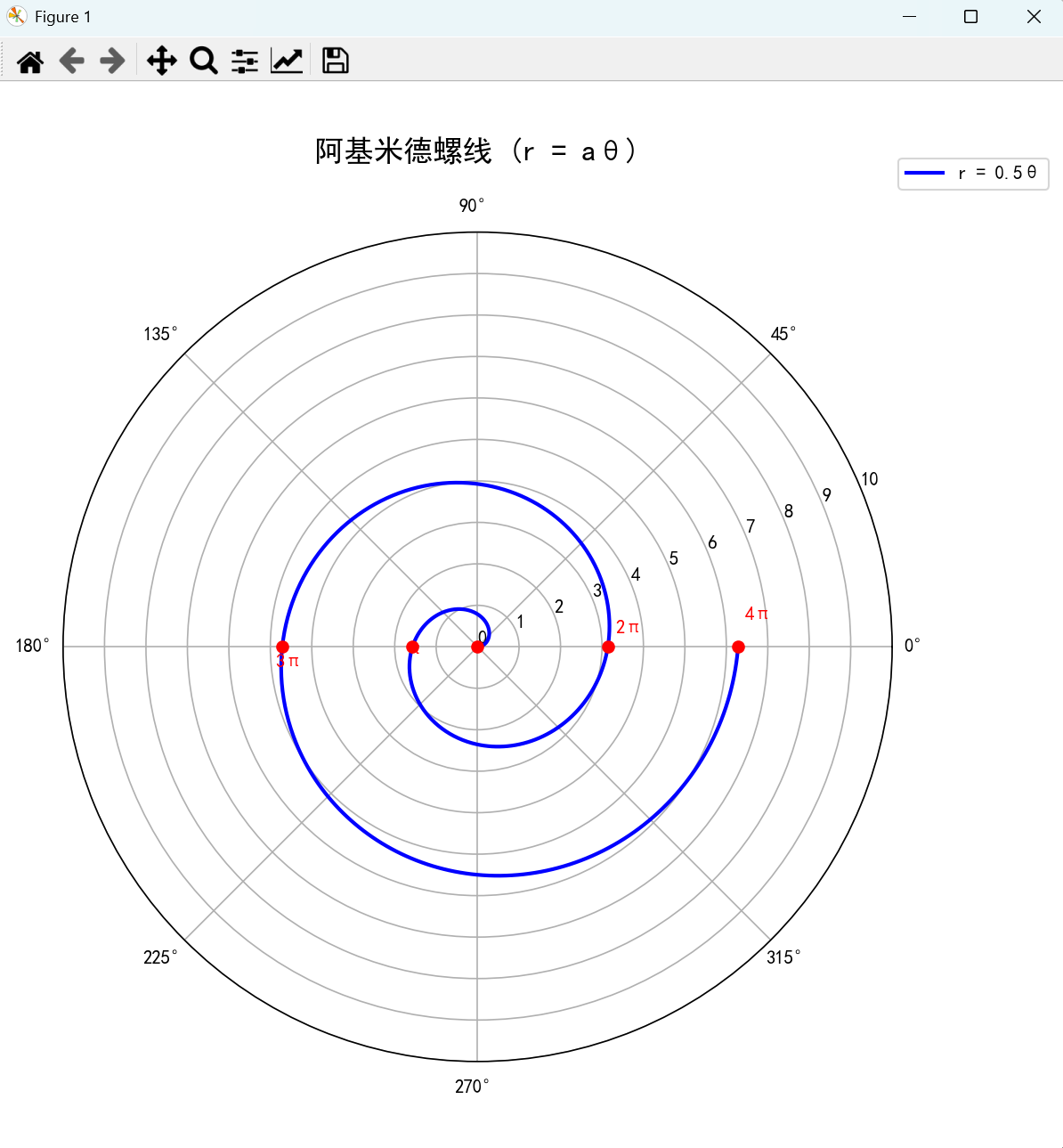 ax.set_title('阿基米德螺线 (r = aθ)', fontsize=16, pad=20)