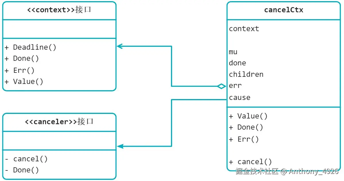 通过接口的设计可以分析出上下文是支持失效的,cancelCtx的设计目的是让上下文具有**随时可以失效**的能力。这种能力被封装为了一个接口,就是 canceler。