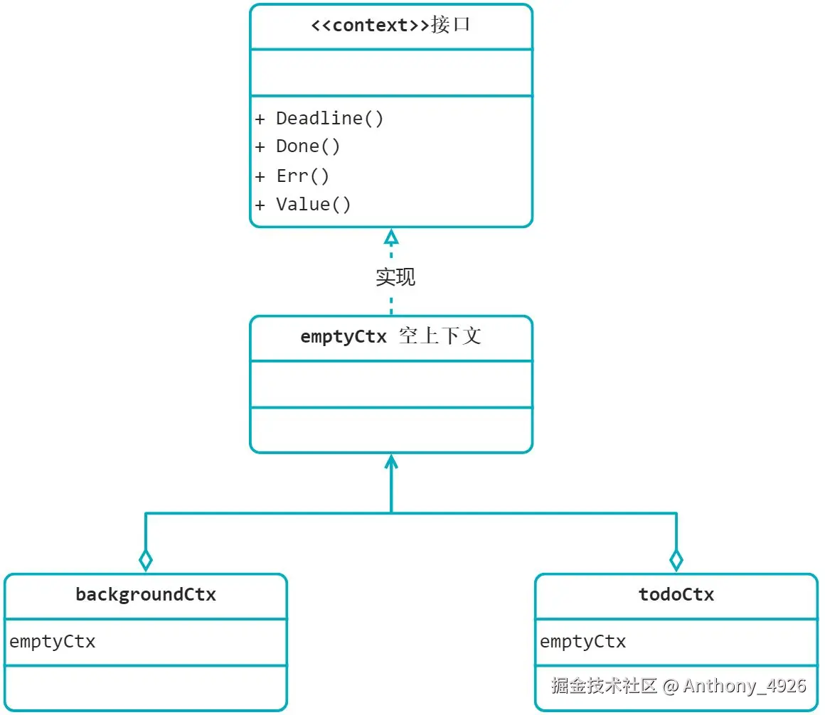 源码中对于context接口的直接实现只有 emtpyCtx, 我们常用的 backgroundCtx 和 todoCtx 则是组合了 emptyCtx。由于Golang没有集成,这对于Golang来说也算是间接实现了 context 接口。