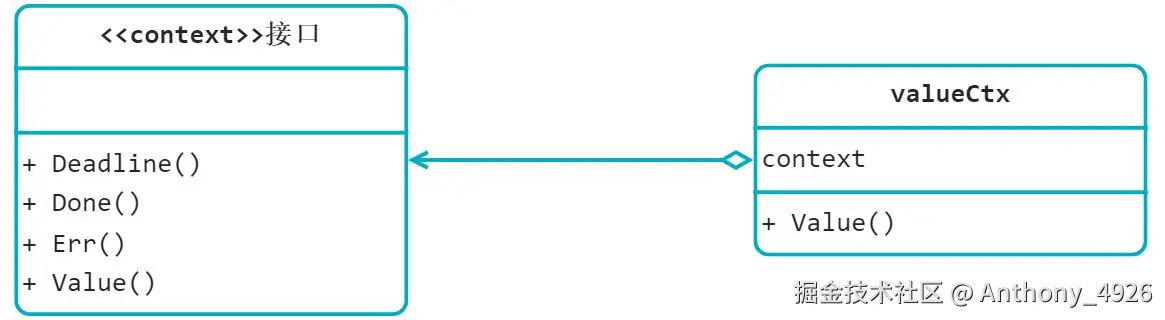 从类图角度valueCtx组合了context接口。Golang为valueCtx单独提供了一个构造函数