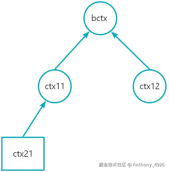 构造 ValueCtx 时,Golang提供了一个构造器,生成一个新的实例。事实上,对于上下文的每一个功能,Golang都提供了构造器。构造器中都会传入父context实例。还是以 ValueCtx 为例,如果多次调用,就会形成一颗context树,但是是指向父节点的树。树种的节点可以是各种直接、间接实现ctx的实例,包括但不限于 backgroundCtx、ValueCtx。