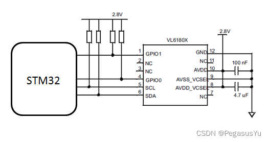 STM32采用Open-drain方式和VL6180X的连接如下所示,注意VL6180X本身是2.8V供电要求的芯片: