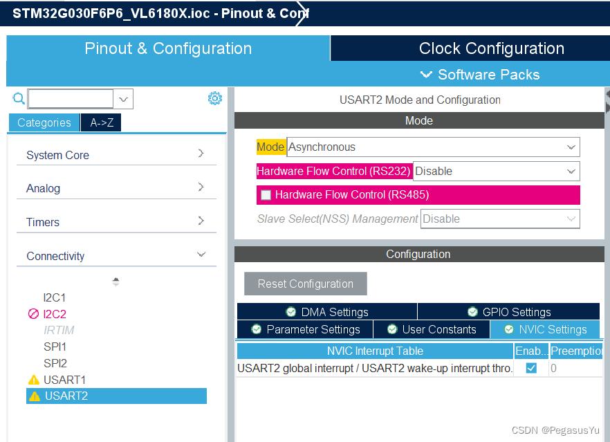 这里以STM32G030F6P6(32K Flash)和STM32CUBEIDE开发环境为例,实现VL6180X的访问控制,采用非中断判断数据可读方式,通过寄存器读取数据有效状态。