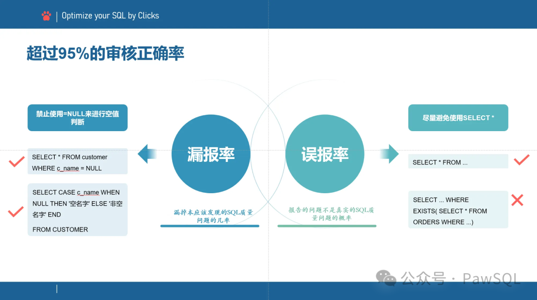 PawSQL 通过自研的SQL解析器,基于语法树分析,结合上下文信息的实时感知,能够准确、高效地匹配SQL结构,从而显著降低漏报率和误报率,提升了SQL审核的准确性。