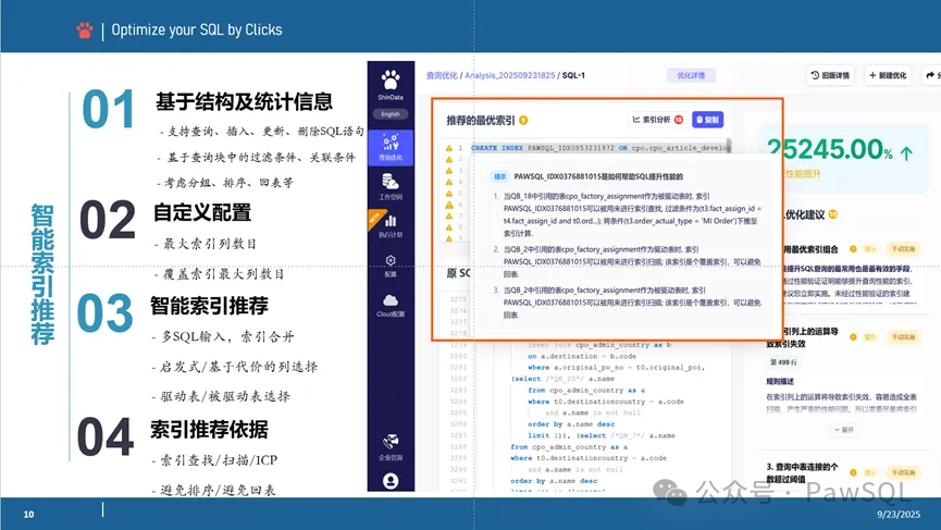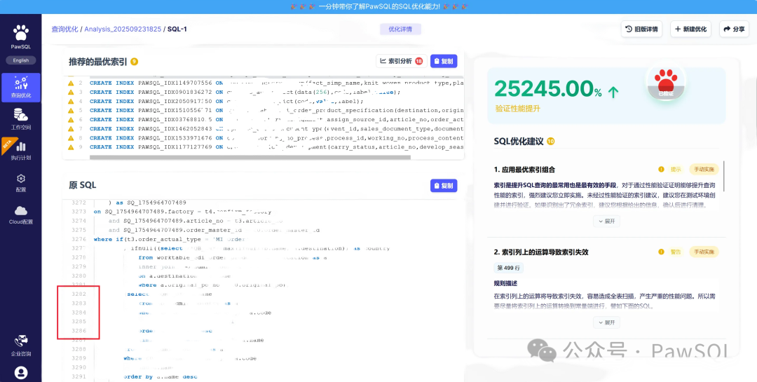 PawSQL审核工具通过分析SQL的结构、数据库对象定义(DDL)及统计数据,为用户的查询生成高效的索引策略,提供索引创建前后的性能提升,并解释推荐索引如何能够提升SQL查询的性能。
