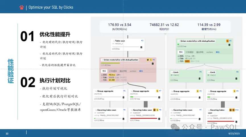 PawSQL审核工具还会对推荐结果进行性能验证(What-if分析),对比优化前后的执行计划和代价,确保重写优化和索引推荐的建议能带来实际的性能提升。如图所示,我们对比了优化前后的执行计划,其中标识了优化前后的执行时间以及估算的代价,可以看到执行计划获得400倍左右的提升。