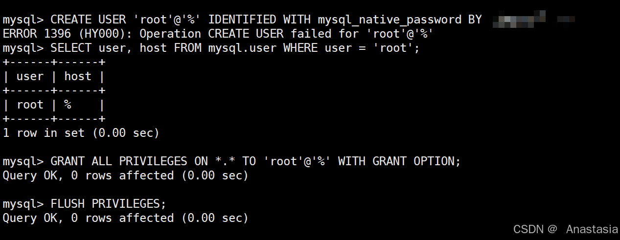 如果出现报错,先看是不是已经创建好root了。已经建好了,直接授权就行。