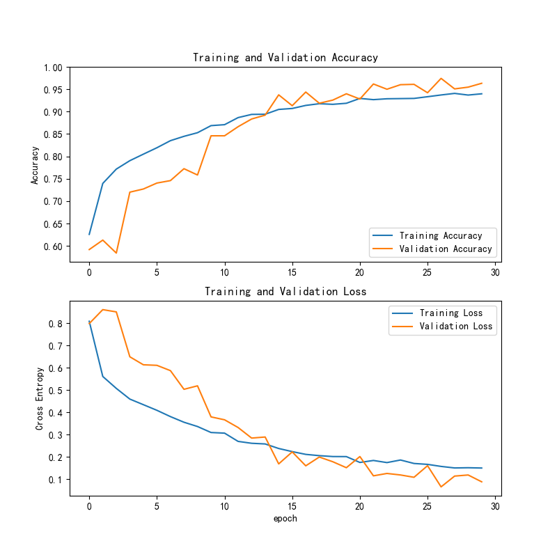 该图展示了模型在训练过程中训练和验证准确率以及损失的变化趋势。在训练阶段,训练准确率稳步上升,最终趋于稳定,表明模型在训练集上逐渐学习并优化特征。与之相对,验证准确率虽然也呈上升趋势,但波动较大,尤其在训练初期,表现出较差的泛化能力,可能表明模型出现了过拟合。损失方面,训练损失随着训练的进行持续下降,验证损失则在初期较高,随着训练的深入逐步减小,但整体波动较大,进一步证明了过拟合的可能性。总体而言,模型在训练集上表现较好,而在验证集上的波动较大,提示需要采取措施改善验证集的表现,如使用正则化技术以提高模型的泛化能力。