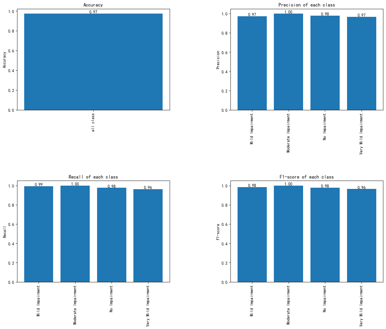 各类认知障碍的分类性能评估:准确率、精确率、召回率与F1分数图