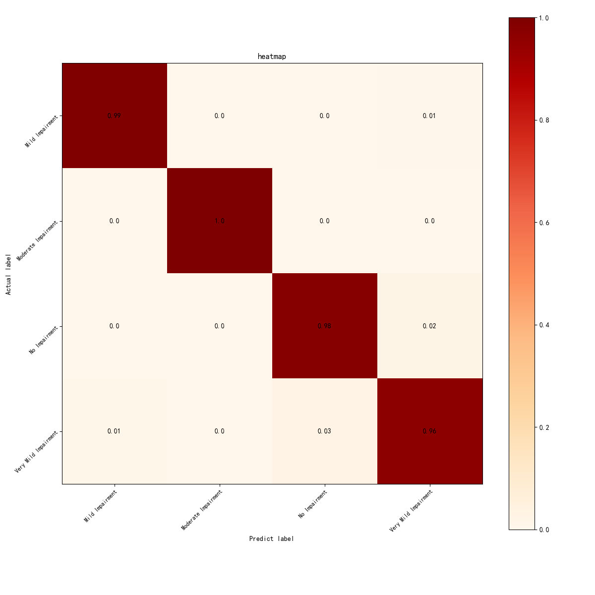 该热力图展示了模型在不同认知障碍状态下的混淆矩阵。矩阵中的数值代表了实际标签和预测标签之间的匹配程度,数值越大,模型预测越准确。例如,在"轻度认知障碍"类别中,模型正确预测了99%的样本,而在"无认知障碍"类别中,模型正确预测了98%的样本。整体而言,模型在四个类别中的表现都非常好,特别是在"中度认知障碍"和"无认知障碍"类别上,几乎达到了100%的准确率。这表明模型在这些类别上的泛化能力较强,误分类率较低。只有在"极轻度认知障碍"类别中,模型出现了少量的误分类。总体而言,热力图显示出模型在识别不同认知障碍状态时具有较高的准确性和良好的表现。