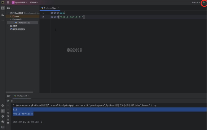 第9步:点击绿色箭头,运行 1.helloworld.py 文件