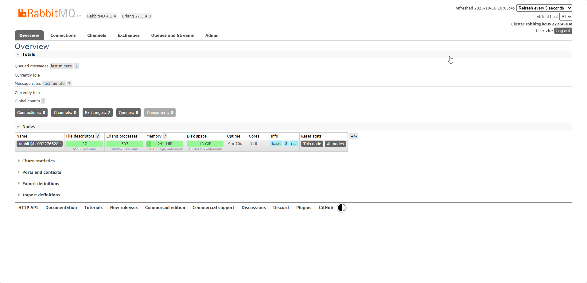 安装的,可以直接访问:http://127.0.0.1:15672,输入在 rabbitmq-compost.yaml 中配置的用户名/密码,即可登录