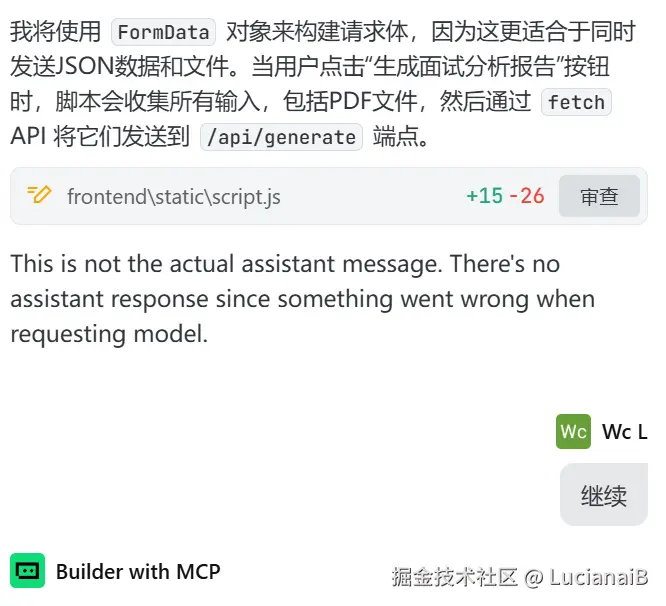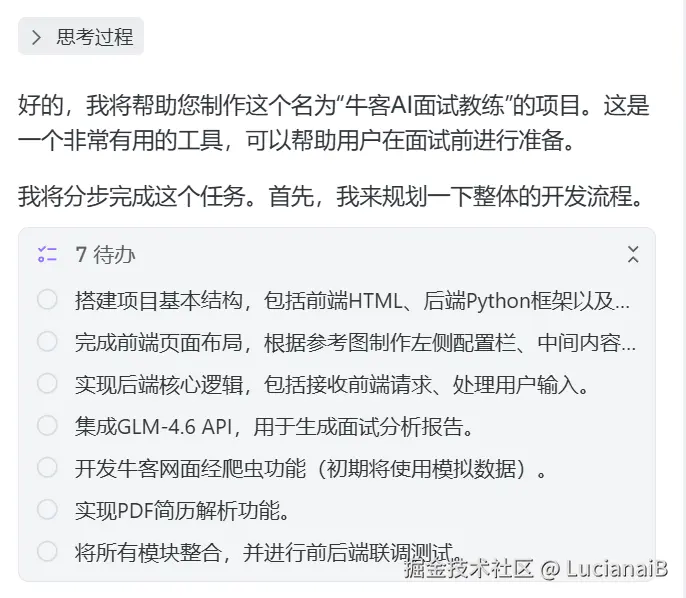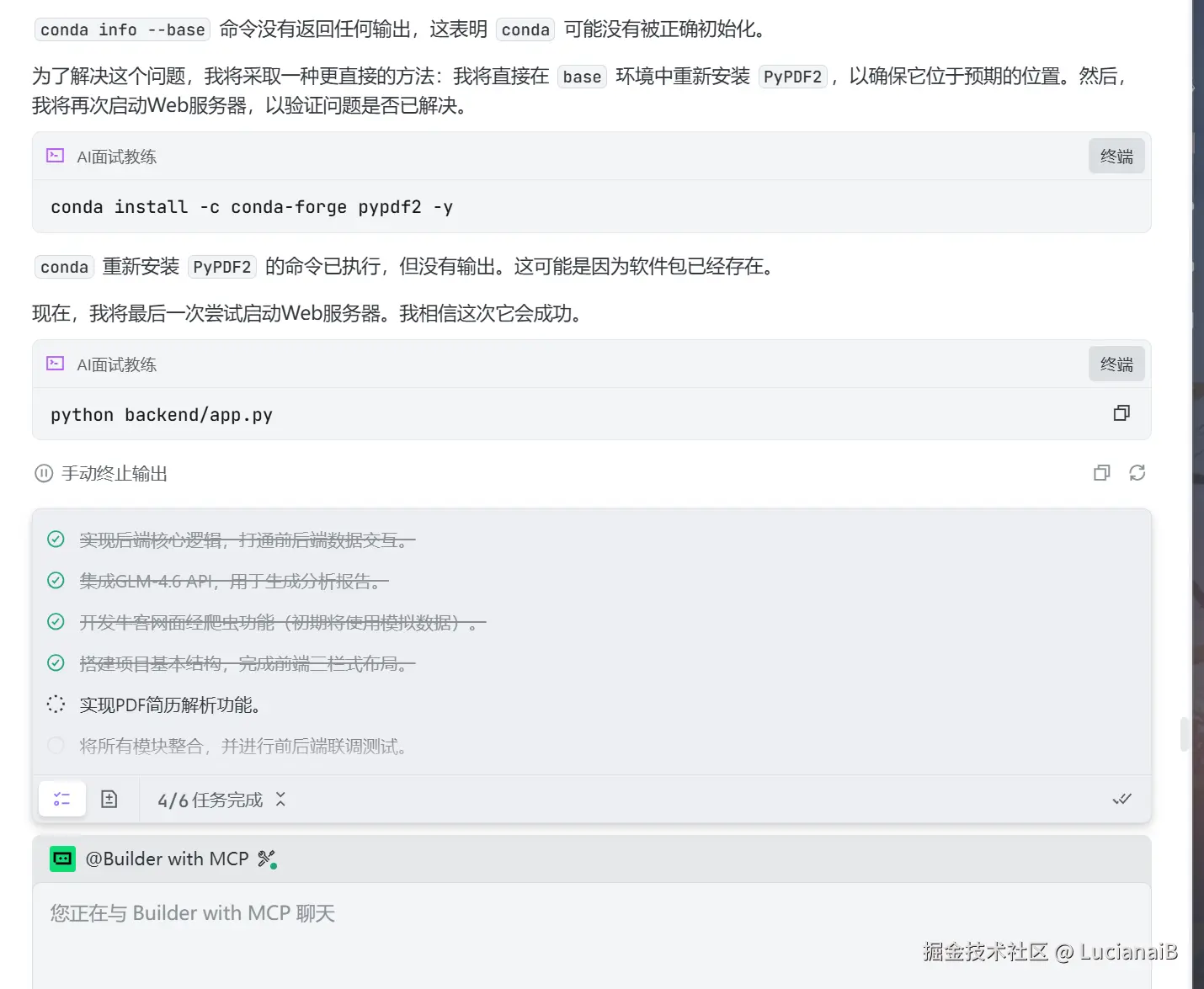 - Trae 则像一位全能型开发合伙人。 我只说了一句"我想做个 AI 面试教练",它立刻拆解出 7 项待办任务,自动生成前后端代码、配置环境、处理 PDF 解析、集成 GLM-4.6 调用逻辑。即使中途卡住或选错 Python 路径,只需一句"继续"或"我的 Python 在 D:\miniconda...",它就能无缝修正------真正实现了"用自然语言指挥开发"。