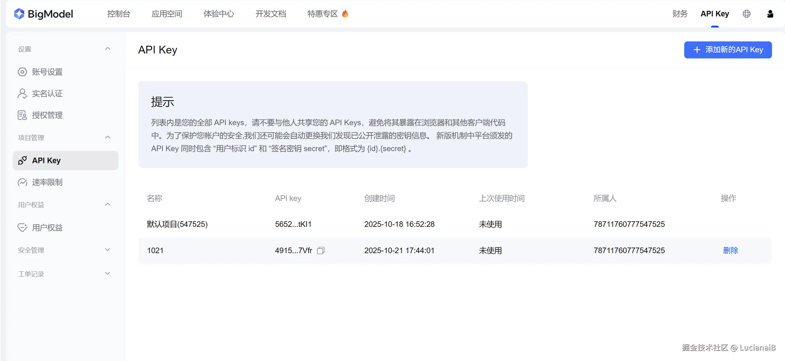 - 前往 API Key 管理页面,新建一个 API Key 并保存备用。