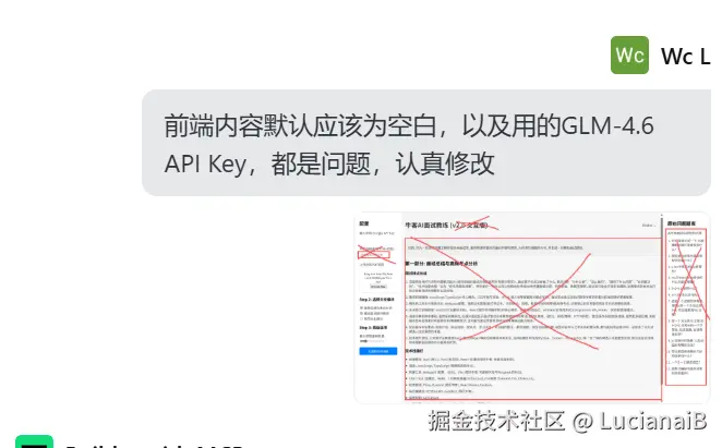 前端内容默认应该为空白,以及用的GLM-4.6 API Key,都是问题,认真修改
