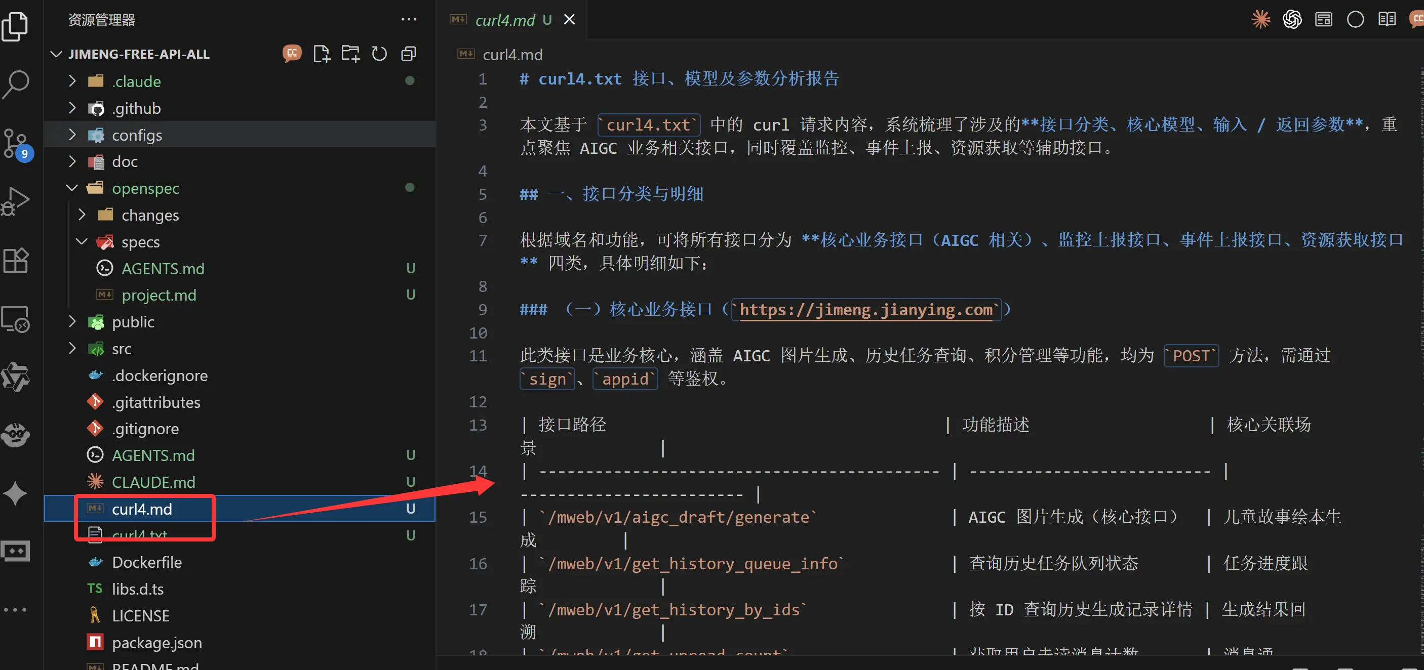接下来我们需要简单交代一下jimeng-free-api-all 项目,这个项目是即梦文生图、文生视频的接口是基于3.0的。目前最新的即梦支持4.0 了。所以我们需要实现即梦4.0 文生图,图生图,文生视频等功能。 这里我们还依赖一下其他的资料。关于这块资料我们就不做详细展开了。 新增加的2个文件是curl4.txt 、curl4.md