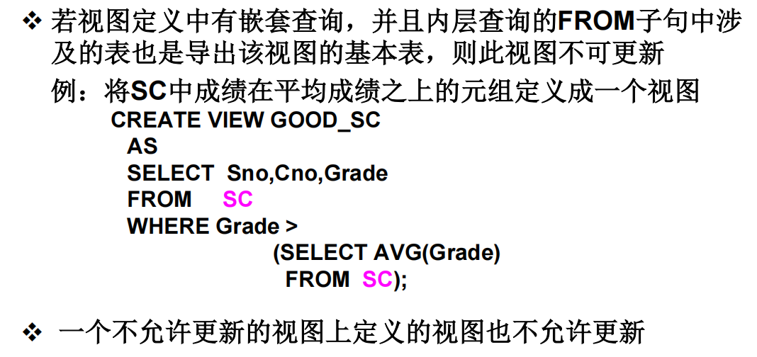 - 当对视图的更新操作无法唯一地映射回对基本表的操作时,该视图就是不可更新的。