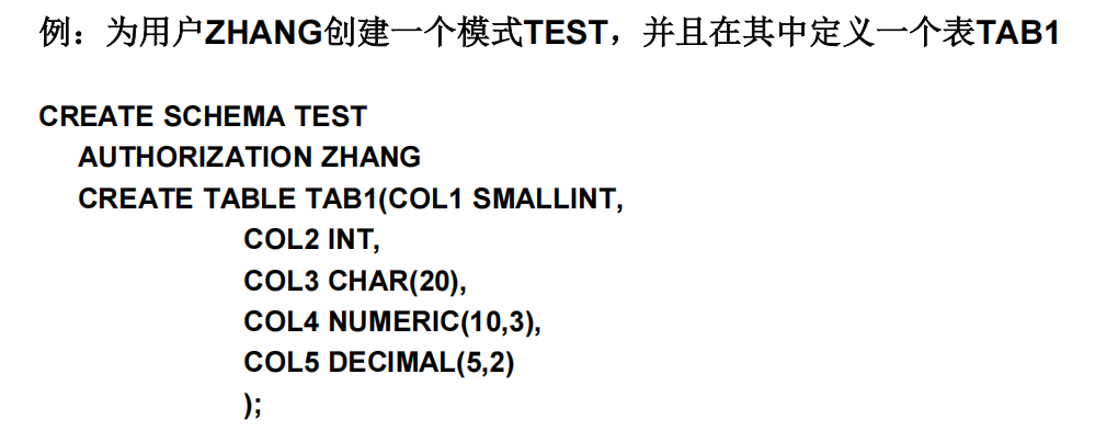 CREATE SCHEMA [<模式名>] AUTHORIZATION <用户名>;