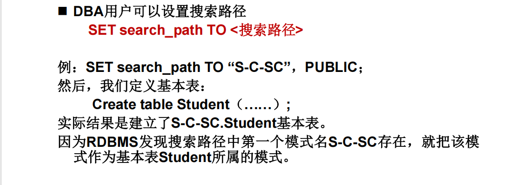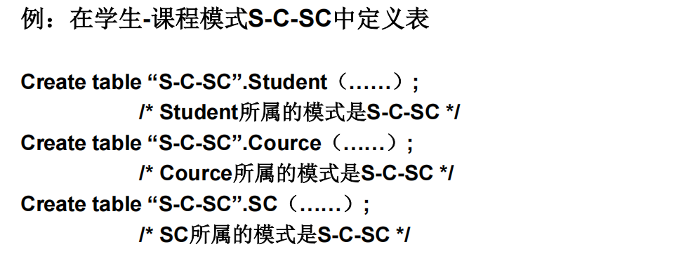功能: 为指定用户定义一个模式,定义模式实际上定义了一个命名空间,在这个空间中可以进一步定义该模式包含的数据库对象,例如基本表、视图、索引等等。