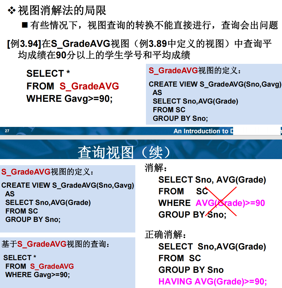 sql-- 示例:定义一个包含学生学号及其平均成绩的视图 CREATE VIEW S_GradeAVG (Sno, Gavg) -- 必须为聚集函数列指定名称 AS SELECT Sno, AVG(Grade) FROM SC GROUP BY Sno;