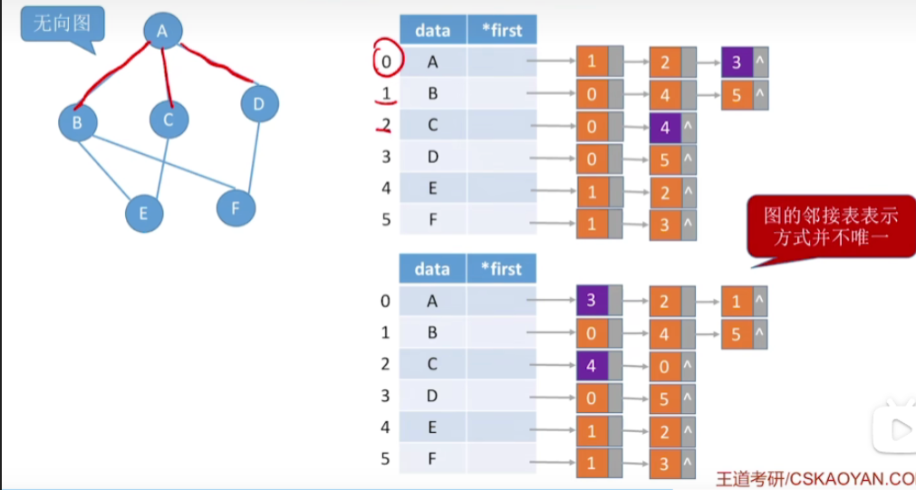 - 图的邻接表表示方式并不唯一,比如说A这个节点和BCD都相连