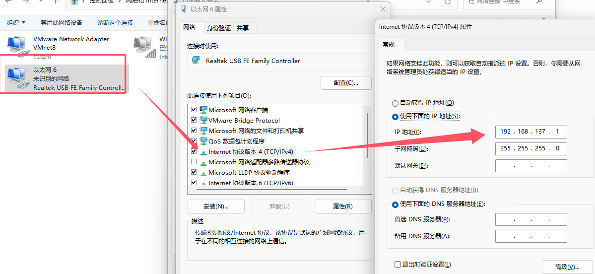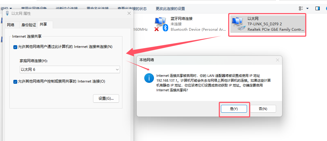 方法二:使用以太网的网络共享,这样默认主机地址为192.168.137.1