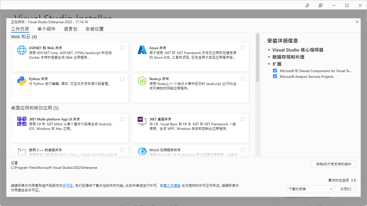 由上可见,Visual Studio将WinFrom、MVC等传统集成的功能全部分离出来,按需安装。