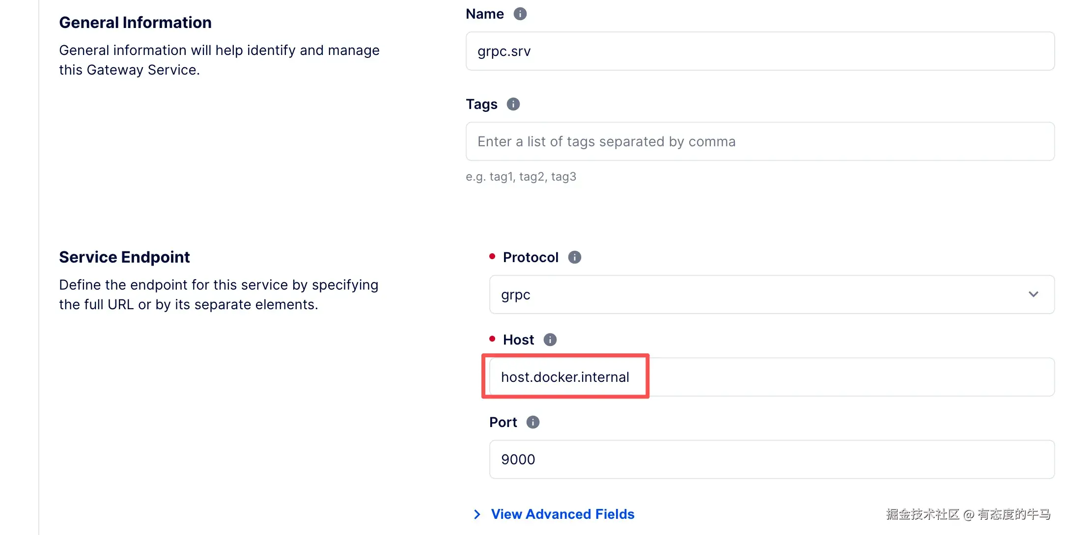 本例的grpc服务是宿主机上9000端口的服务,本次网关容器内不可使用localhost表征宿主机,mac容器内宿主机标识是host.docker.internal