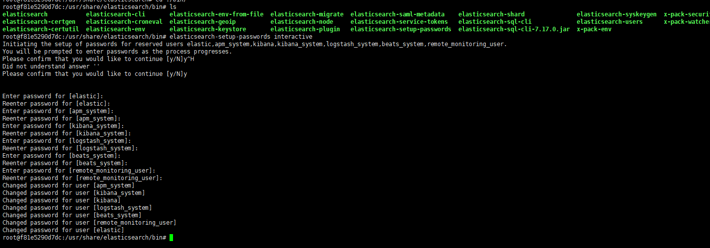 #4、依次设置用户:elastic、apm_system、kibana_system、kibana、logstash_system、beats_system、remote_monitoring_user 密码,并进行密码确认
