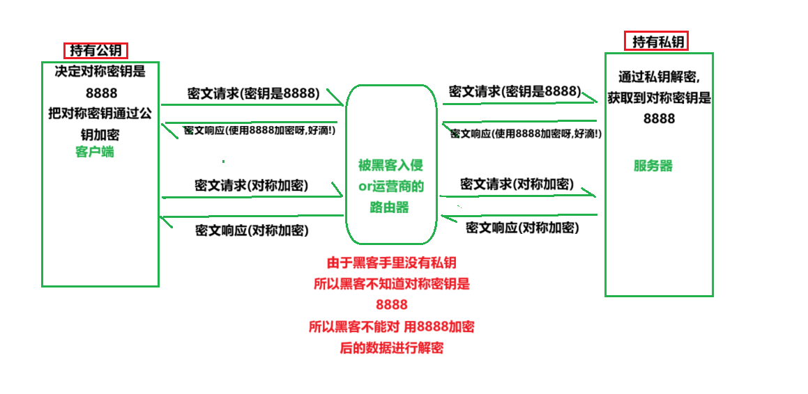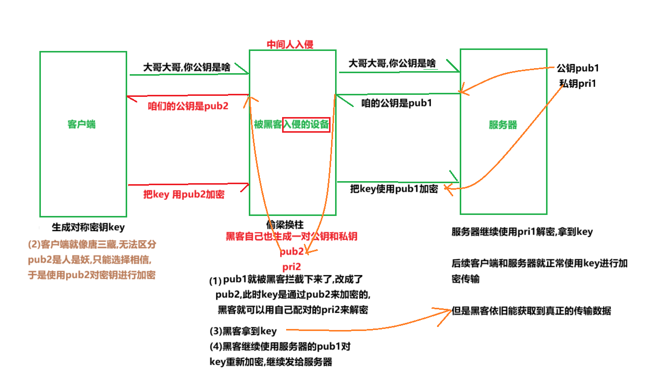 上述这样的流程存在重大安全隐患,黑客可以通过特殊手段来获取到对称密钥,破坏后续传输的安全性中间人入侵