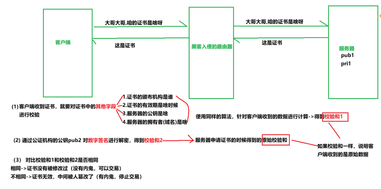 引入校验机制,中间人攻击的关键,在于客户端无法区分收到的公钥是不是真正的 来自服务器的公钥还是被黑客篡改过的公钥->想办法对公钥进行校验