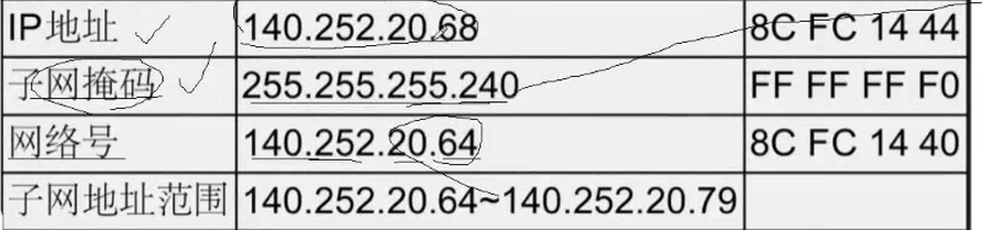IP地址为140.252.20.68 最后的网络号为 140.252.20.64 可以分配15台主机,需要注意的是主机号为全0的叫做主机地址,为全1叫广播地址。