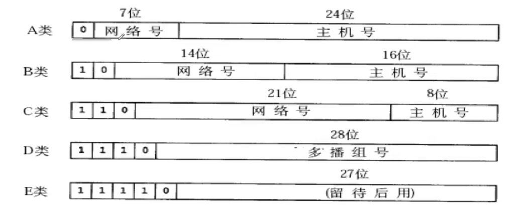 刚开始采用如下图的分类方式,分为五类,随着Internet的⻜速发展,这种划分⽅案的局限性很快显现出来,这样的划分粒度太粗了,⼤多数组织都申请B类⽹络地址,导致B类地址很快就分配完了,⽽A类却浪费了⼤量地址。