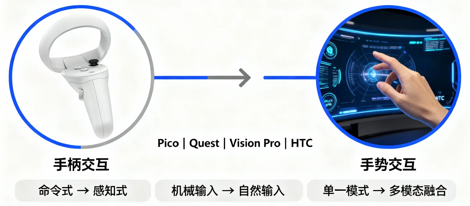 在传统VR系统中,主要交互方式依赖手柄(Controller)------通过按钮、摇杆和触发键进行输入。然而,随着Pico、Quest、Vision Pro等设备的传感系统升级,XR正在从 "手柄交互" 迈向 "无控制器交互" 时代。