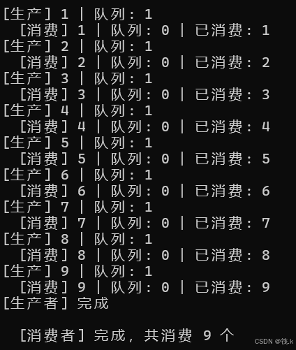 std::cout << " [消费者] 完成,共消费 " << count << " 个\n" << std::endl;
