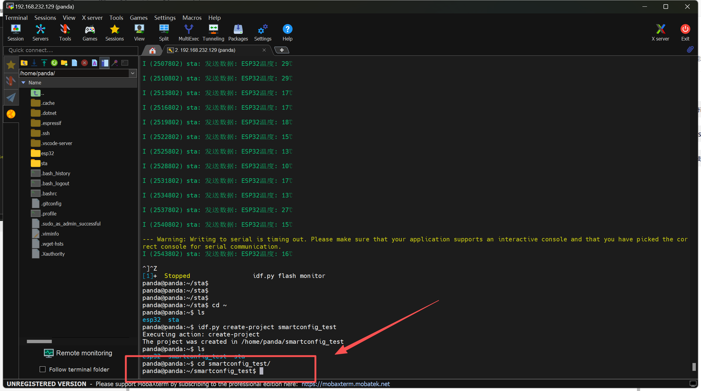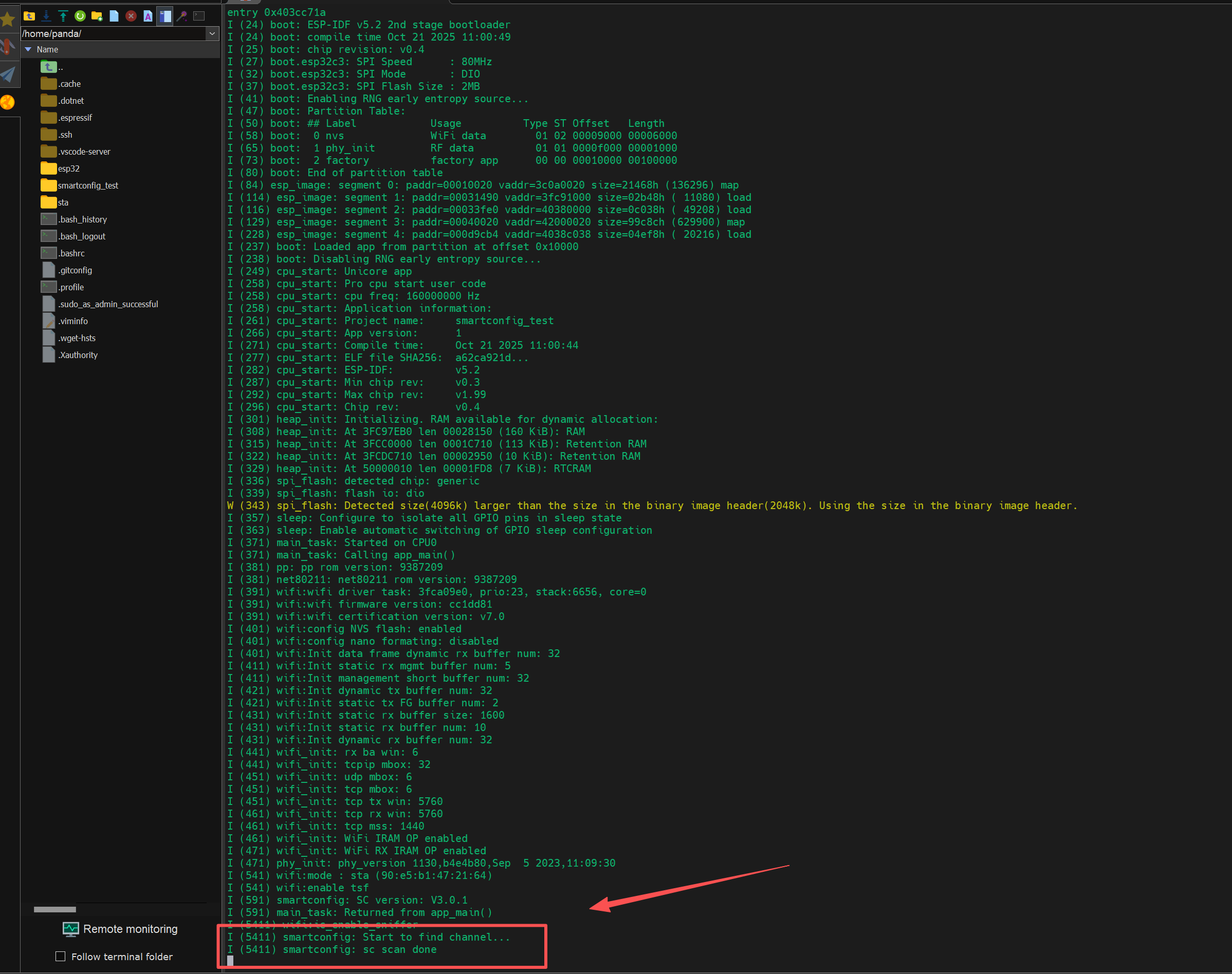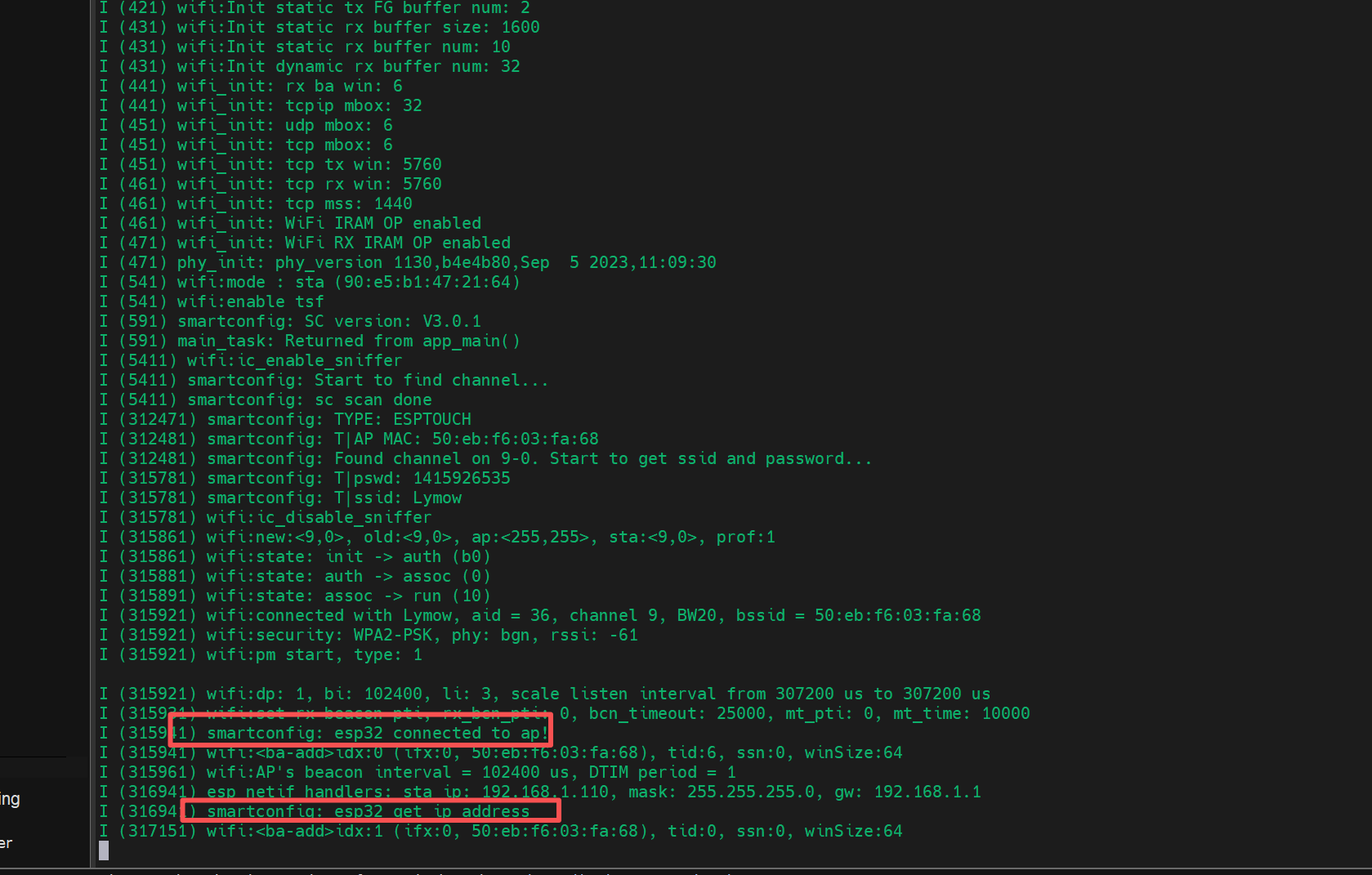 11、手机上广播之后,我们查看终端,发现ESP32连接上WiFi了,一键配网完成