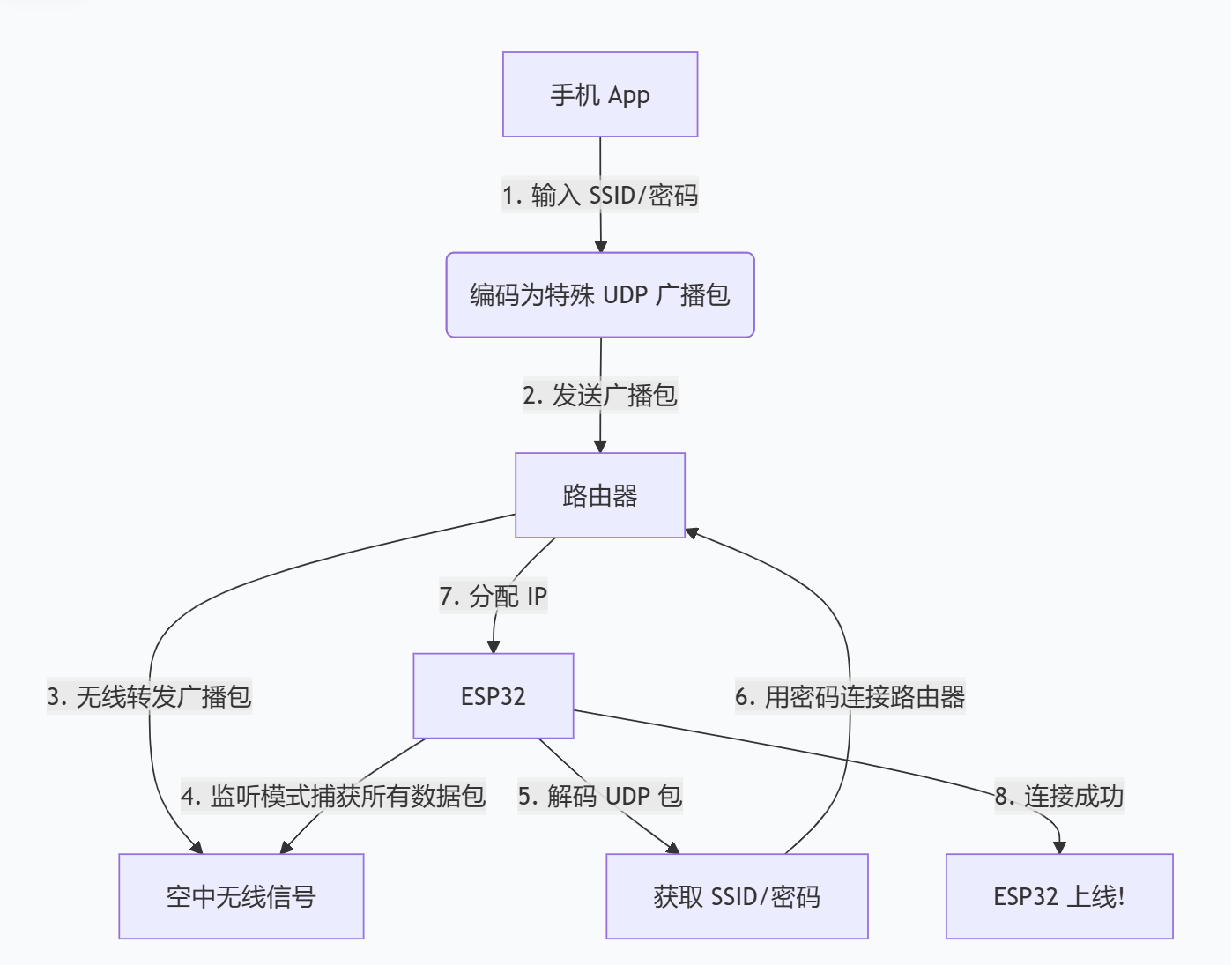 1、 准备阶段:ESP32启动后,进入SmartConfig模式。它本身不连接任何Wi-Fi,但会打开"耳朵"(Wi-Fi监听模式),扫描空气中特定的数据包。