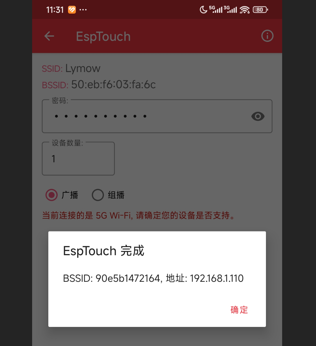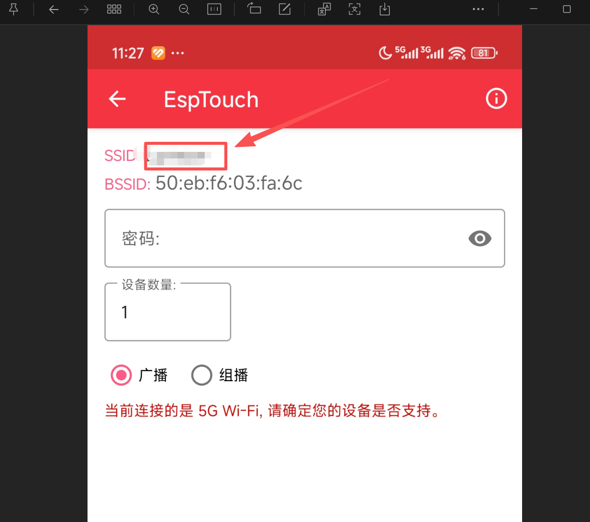 10、在这里写入手机上连接的wifi 的密码,选择广播,然后确认。还得看esp32的型号,有些esp32连接不上5G的网络,尽量用2.4G的去尝试