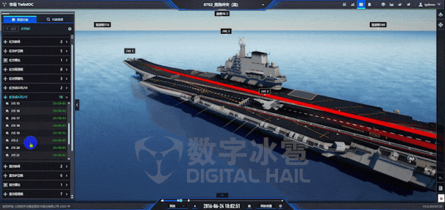 用户可灵活定义数字孪生场景的地理位置、层级结构(如全球战区-区域战场-具体设施),并标绘式添加兴趣点位、指引路线、重点区域(如航母航线、禁航区)、辅助标尺等。这使得航母战斗群的部署能够精确贴合真实地理环境。