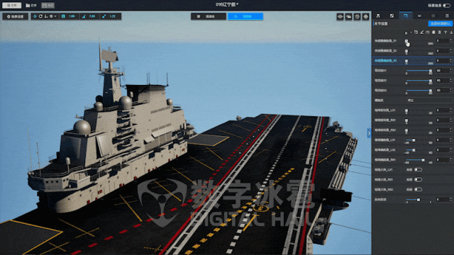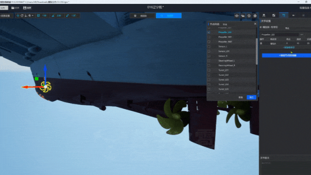 (2)动力系统:位于水下的螺旋桨同样被赋予了数据驱动能力。我们为其定义了"转速"关节。通过接入动力系统的输出参数,该关节的数值变化可以驱动螺旋桨模型做出相应转速的旋转动画,直观反映航母从停泊、巡航到最高航速的动力状态变化。