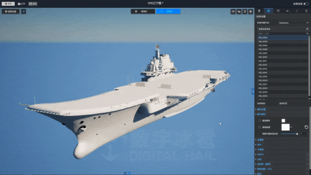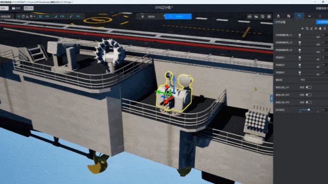 更重要的是,我们运用模型编辑器对航母上的各类关键功能装置进行了深度的关节编辑与数据驱动接口预置,使其从一座静态的钢铁巨岛变为一个可动态响应的智能孪生体:
