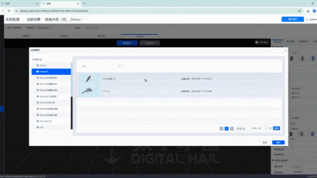 (1)所见即所得的位置编辑:可直接导入战场三维场景服务,直接在三维场景中拖拽放置航母、舰载机、护卫舰等孪生体对象孪生体。