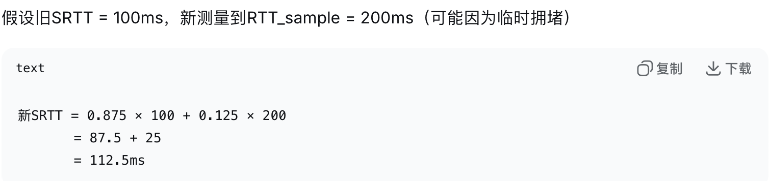 - SRTT更新: 新SRTT = 0.875*100 + 0.125*110 = 101.25ms, 看, SRTT被这个正