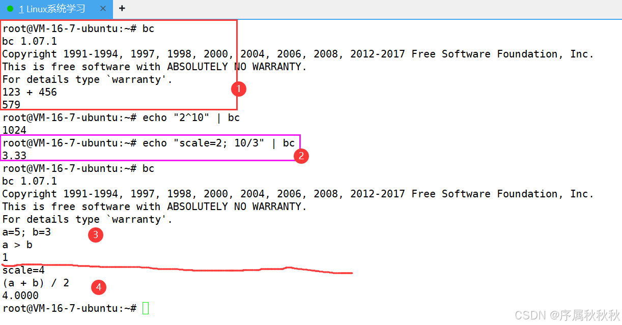 bash# 基本运算 echo "100 - 3*15" | bc # 计算 100-45,输出 55 echo "10/3" | bc # 整数除法,输出 3 echo "scale=2; 10/3" | bc # 保留 2 位小数,输出 3.33 # 幂运算与平方根 echo "2^8" | bc # 计算 2的8次方,输出 256 echo "sqrt(625)" | bc -l # 计算平方根(需加 -l),输出 25.0000000000 # 数学函数(弧度制) echo "s(1)" | bc -l # 计算 sin(1) 弧度,输出约 0.8414709848 echo "l(10)" | bc -l # 计算自然对数 ln(10),输出约 2.3025850930 # 交互式模式下的变量与比较 bc a=5; b=3 a*b # 输出 15 a > b # 输出 1(真) scale=4 (a + b) / 2 # 输出 4.0000