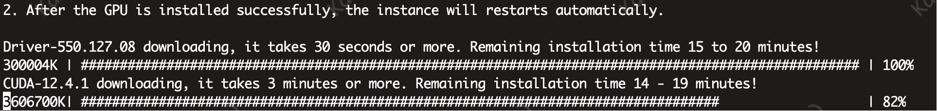 1. The installation takes 15 to 20 minutes, depending on the intranet bandwidth and the quantity of vCPU cores of the instance. Please do not operate the GPU or install any GPU-related software until the GPU driver is installed successfully.