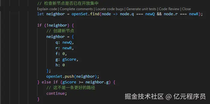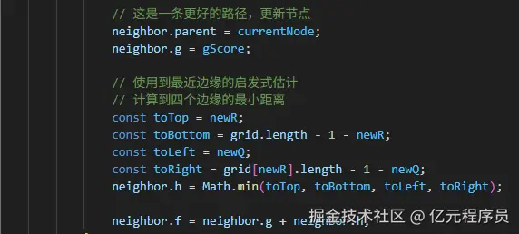 e. 如果邻居节点已在开放列表中,检查当前路径是否更短,如果更短则更新G值和父节点。