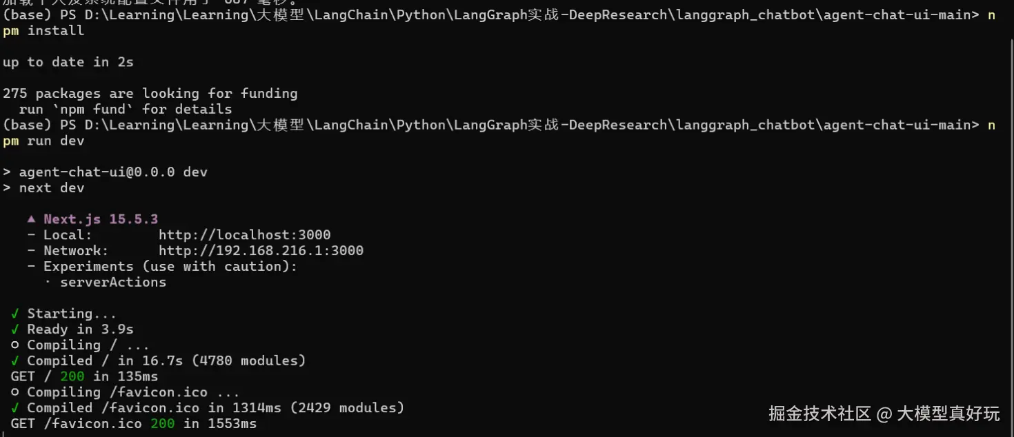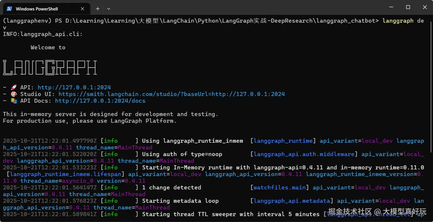 即可启动项目。启动成功后看到三个链接,第一个链接是部署完成的服务端口,第二个是LangSmith的监控页面,第三个是端口的说明文档。