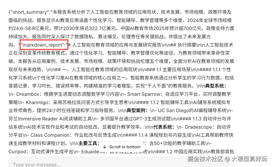 可以看到智能体成功输出了一份指定格式的报告内容: